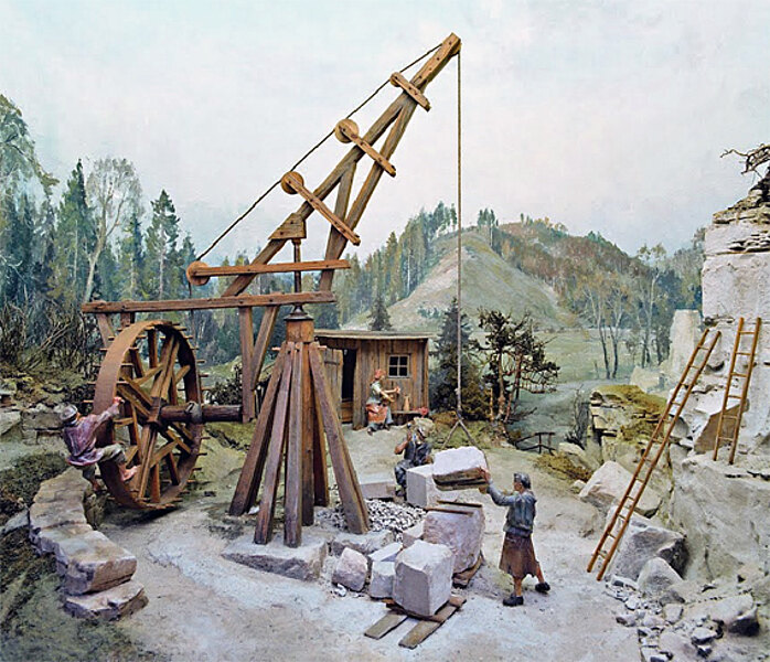 Schon die alten Ägypter mussten viel Erfindungsgabe und technisches Wissen aufwenden, um die großen, schweren Steine zum Bau der Pyramiden an die richtigen Stellen zu transportieren. Das Problem beim Bewegen von schweren Lasten wurde noch bis in das 19. Jahrhundert im Wesentlichen unter der Anwendung der einfachsten Regeln der Mechanik mit menschlicher Muskelkraft gelöst. Ein sehr anschauliches Beispiel dafür steht im Deutschen Museum in München. In einem Steinbruch im Süden von Paris trieb bis etwa 1890 ein Sprossentretrad die Seile eines Drehkrans zum Heben und der horizontalen Verlagerung großer Lasten.