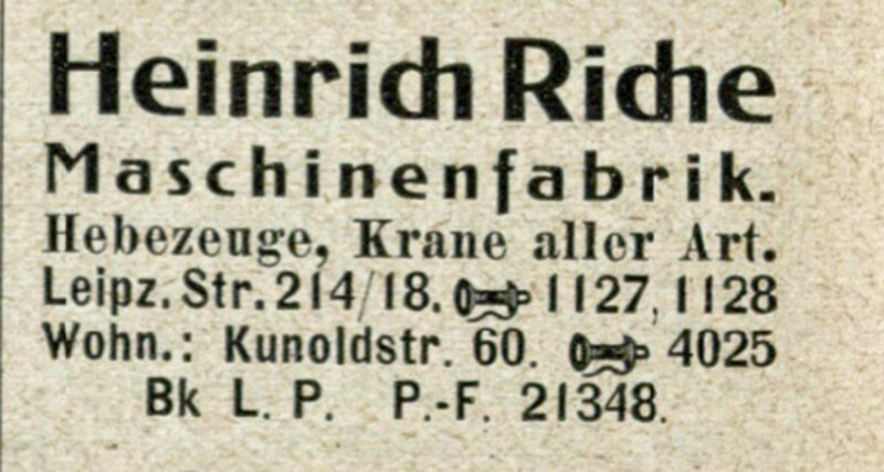 Der gestiegene Absatz veranlasste H. Rieche dazu, 1913 sein Werksgelände um die Grundstücke Leipziger Straße 216 – 218 zu erweitern. Privat wohnte Heinrich Rieche mit seiner Frau Ida zu der Zeit in der Kunoldstraße 60.