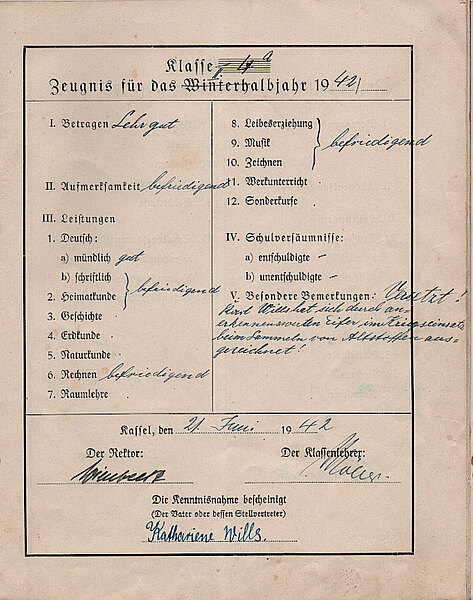 Inzwischen nahm der Krieg seinen Lauf und auch die Luftschutzsirene von gegenüber ertönte immer häufiger. Ihr auf- und abschwellender Ton ging durch Mark und Bein. Es sind auch schon Bomben in Kassel gefallen und am nächsten Tag nach Angriffen ist Splittersuche. In der Schule haben wir verstärkt schon Unterrichtsausfall und werden angehalten, Altmetalle, Knochen und Papier zu sammeln. Ich beteiligte mich vorbildlich. Die Suche nach Metall ging soweit, dass wir z.B. eine Zinkbadewanne aus einem Kleingarten mitnahmen. Ich sammelte wie besessen, so dass ich am Ende des Schuljahres das Buch erhielt: „Bei Tannenberg zwei Schlachten“ mit der Eintragung: „Für fleißige Sammeltätigkeit im Kriegsjahr 1942“ erhielt. Diesen Eintrag bekam ich auch ins Schulzeugnis.