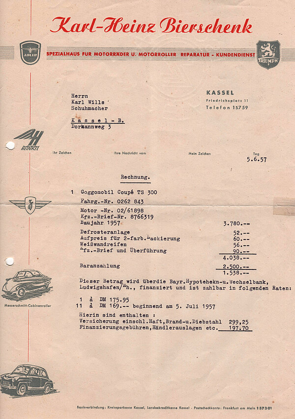 „Im Jahr 1957 hatte ich gerade meinen Führerschein der Klassen 3 und 4 auf einem Ford 15M mit Lenkradschaltung gemacht. Mit 25 hatte man damals nicht das Geld um sofort ein Auto zu kaufen. Glücklicherweise konnte ich mich durch einen kleinen Lottogewinn von 2500 DM auch noch im selben Jahr nach einem „Fahrbaren Untersatz“ um sehen. Bei der Firma Karl-Heinz Bierschenk am Friedrichsplatz in Kassel fand ich das richtige Modell. Meine Wahl fiel auf eine Goggomobil Coupe` TS. Mit 15 PS bei 300cm³ und einem elektromagnetischen Vorwählgetriebeschalter am Armaturenbrett war er der Renner. Kein Schalthebel, der Gang sprang nach Vorwahl beim Bedienen der Kupplung selbst ein. Mit diesem spritzigen Zweitakter-Twin-Motor auf Strecke zu gehen, dass war für mich als Fahranfänger ein ganz tolles Gefühl. Das Auto war der Ferrari des kleinen Mannes.