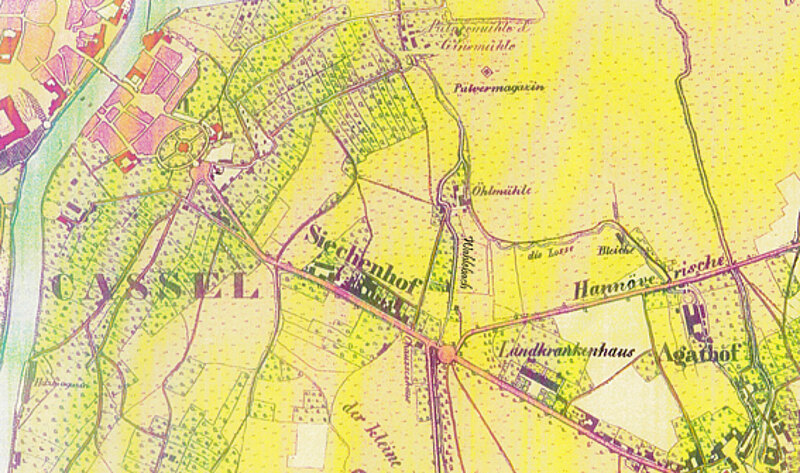 Auf einer Zeichnung von 1829 sieht man ein einzelnstehendes Haus, das vermutlich eine Mühle darstellen soll, vor dem Panorama der Stadt liegen. Über die Hannöverische Straße (später Sandershäuser Straße) im Vordergrund ziehen die Pferdegespanne ihre Ladung Richtung Cassel.