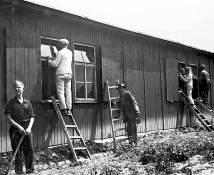 Uns wurde eine Baracke zugewiesen. Vierundzwanzig Männer in einem Raum. Wir füllten Strohsäcke mit Holzwolle und warfen sie nebeneinander auf den Boden. Am nächsten Tag sollten wir Betten zusammenbauen. Es gab keine Schränke. Als wir unsere Matratzen gefüllt und uns im Waschraum frisch gemacht hatten, hatte der größte Teil der Niedergeschlagen die Kontrolle wiedererlangt und am Abend waren alle wieder in bester Stimmung.“