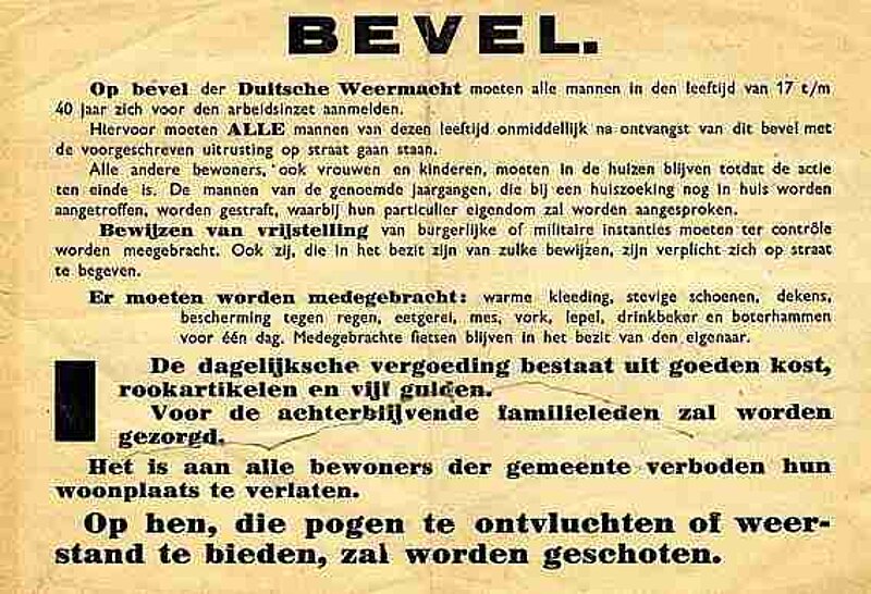 [Übersetzung: „Auf Befehl der Deutschen Wehrmacht müssen sich alle Männer im Alter zwischen 17 und 40 Jahren für den Arbeitseinsatz anmelden. Dazu müssen sich alle Männer dieses Alters unmittelbar nach Empfang dieses Befehl mit der vorgeschriebenen Ausrüstung auf die Straße stellen. Alle anderen Bewohner, auch Frauen und Kinder, müssen in den Häusern bleiben, bis diese Aktion beendet ist. Die Männer der genannten Jahrgänge, die bei einer Hausdurchsuchung im Haus angetroffen werden, werden bestraft, indem auf ihren Privatbesitz zugegriffen wird. Nachweise von Freistellungen von zivilen oder militärischen Behörden müssen zur Kontrolle beigebracht werden. Auch solche, die solche Nachweise haben, sind verpflichtet, sich auf die Straße zu begeben. Es muss mitgebracht werden: warme Kleidung, feste Schuhe, Decken, Regenschutz, Essgerät, Messer, Gabel, Löffel, Trinkbecher und Butterbrote für einen Tag. Mitgebrachte Fahrräder bleiben Eigentum des Besitzers. Die tägliche Vergütung besteht aus guter Kost, Tabakwaren und fünf Gulden. Für die zurückgebliebenen Familienangehörigen wird gesorgt. Es ist allen Einwohner der Gemeinde verboten, ihren Wohnsitz zu verlassen. Auf jene, die versuchen zu fliehen oder Widerstand leisten, wird geschossen.“]