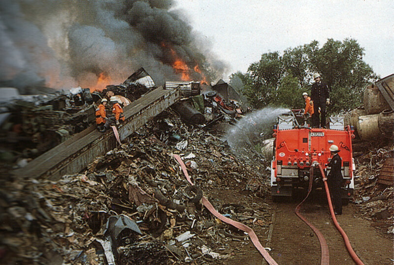 Als am Dienstag den 06. Juli 1982 um 16:44 Uhr die Berufsfeuerwehr zu einem Feuer in den Ölmühlenweg ausrückt, brennt bereits eine Schrotthalde in der Größe von 40 m x 20 m und 10 m Höhe. Schnell wird klar dieser Einsatz wird länger dauern und viele Kräfte und Fahrzeuge binden. Deshalb werden auch sofort die Freiwilligen Feuerwehren im Stadtgebiet zur Verstärkung alarmiert.