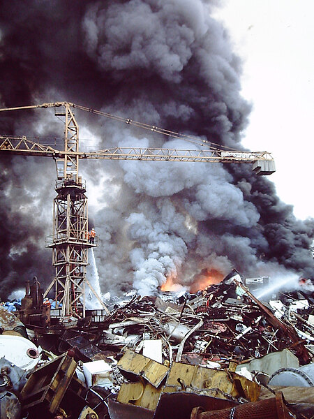 Die eigentliche Brandbekämpfung auf dem Schrottplatz Bachmann nebenan gestaltet sich besonders schwierig da man an den Brandherd und die Glutnester unter den aufgetürmten Metalltrümmern nicht heran kommt. Altreifen und andere brennende Kunststoff und Gummiteile sorgen für eine riesige Rauchwolke, die den Einsatzkräften in der Anfangsphase die Sicht nimmt.