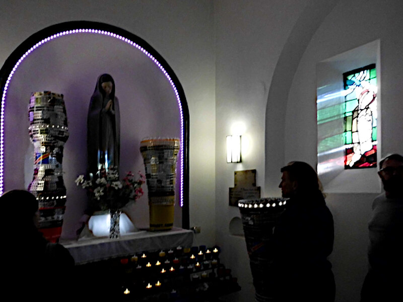 Zur d15, Skulptur und Benzinblechfässer als Kreuz vor dem Gebäude St. Kunigundis