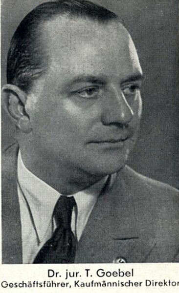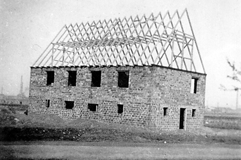 Im Jahre 1934 rührte es sich dann bei unserer Firma Fieseler. Verhältnisse und Umstände erforderten Stellungnahme zum Siedlungsproblem. Direktor Dr. Goebel (Bild links) leitete die vielen Besprechungen zwischen der Firma, Hessenheim und Siedlungsinteressenten und manches Wort musste gewechselt werden, um zu einem Ergebnis zu gelangen. Im Jahre 1935 gelang es dann, den ersten Bauabschnitt unserer Siedlung im Rohbau (Bild rechts) zu erstellen. Jeden Sonntag waren die "Siedler" auf dem Bauplatz, manche Freude und mancher Ärger wurde geschluckt; dann wurden die Häuser verlost. Die Siedler durften Geld einzahlen für den oberen Ausbau, und wer unbedingt an dem festgelegten Termin Einzug halten wollte, wurde um Koks zum Austrocknen der Häuser gebeten. Der Winter war kalt und lang und die Fussböden noch nicht gelegt. Aber trotz aller Schwierigkeiten zogen die Ersten im Mai 1936 ein. Aber ... w i e ! Es gab noch keine Strassen.