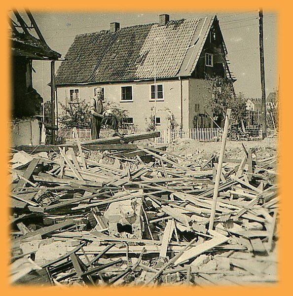 So wäre ja alles in schönster Ordnung. Nur einzelne Siedler zogen sich zurück; sie waren enttäuscht. Wenn nur nicht der Krieg gekommen wäre mit seinen Folgen: Einberufungen, Lebensmittelkarten und vor allem die kleinen Briefe "Für's Vaterland". Ja, es war schrecklich. Dann kam der Segen von oben. Bei nächtlichem Fliegeralarm ging es dann mit Leuchtplaketten in die Bunker. "Licht aus" rief der Mann vom Luftschutz. Es kostete Nerven und Blut - auch in unserer Siedlung. Und so kam dann Ostern 1945 mit den Amerikanern wieder etwas Neues. Alle Siedler arbeitslos.