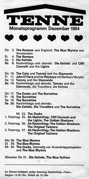 In den 60-ziger Jahren nahm in dem Gebäude Klaus Richter die Tenne in Betrieb. Der Veranstalter setzte völlig neue Maßstäbe. In der Tenne traten englische und deutsche Spitzenbands wie die Kettels, die Rattles, die Fleets, die Sorcerers, Georgie Dee and the Beat Kings, die Sonics und viele andere auf und begeisterten die Jugend mit Rock and Roll und Beat-Musik.