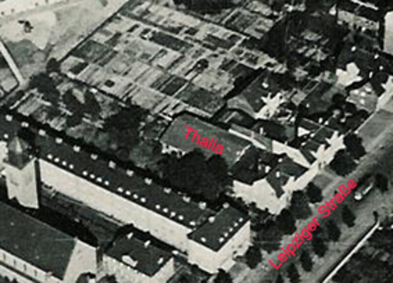 Die Ansichtskarte aus den 1960er Jahren zeigt, v. l., die Leipziger Strasse 151, Bayern Stuben (ehemals Gaststätte Nadler) und Kino (Thalia) sowie die Leipziger Str. 153, Fa. Pilzegrimm. Das Dachgeschoss der Gaststätte wurde im Zweiten Weltkrieg zerstört und nicht wieder aufgebaut.