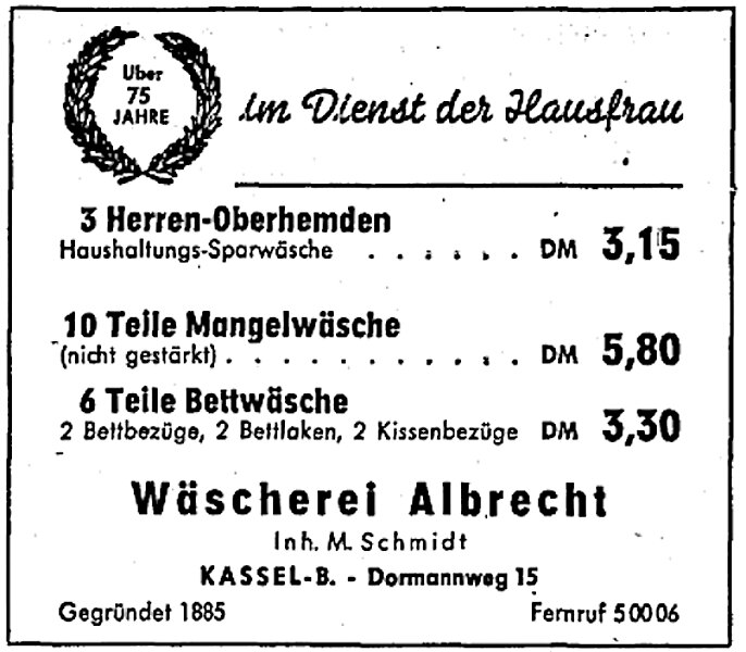 1982 verstarb Wilhelm Schmidt der frühere Inhaber der Wäscherei Albrecht, Kassel-Bettenhausen.