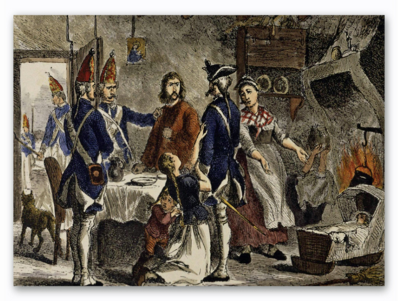 Die Unterbringung der Soldaten der Truppen in Friedenszeiten geschah durch Requisition in den Häusern der Bauern und Handwerker. Für viele der betroffenen Bauern waren die Einnahmen aus der Einquartierung eine willkommene Aufstockung ihrer baren Mittel. Anderseits mussten Bauernsöhne und einfachen Handwerker ihrer Dienstpflicht gemäß in die Truppe eintreten. Zur Rekrutierung kam ein kleiner Trupp Soldaten, klopfte an die Tür der Familie der einzuziehenden jungen Männer zwischen 16 und 30 Jahren, es wird die Dienstpflicht vorgelesen oder in kurzen Worten erklärt, und die im Haushalt befindliche Männer werden mitgenommen. Die Betroffenen, sowohl der Einberufene wie auch dessen Angehörige, fügten sich meist klaglos in ihr „Schicksal“, da diese Vorgehensweise nach damals gültigem Recht stattfand. (Quelle: picture alliance/akg-images )