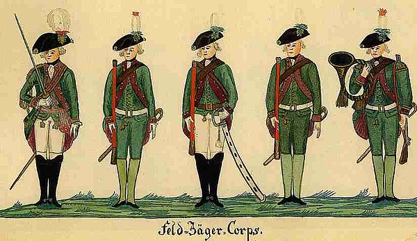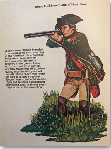 Bildinschrift: Feldjäger waren Gewehrschützen, die die amerikanischen Scharfschützen ausschalten sollten. Viele waren Jäger und Förster, als sie rekrutiert wurden - was sich im Grün ihrer Uniformen widerspiegelt - und trugen oft ihre eigenen Gewehre, die von ausgezeichneter Qualität waren, zusammen mit persönlichen Seitengewehren. An diese schweren Gewehre konnte keine Bajonette angebracht werden. Die Jäger galten als Eliteeinheiten und agierten während der amerikanische Revolution in fast jeder größeren Aktion als Späher und Kämpfer.