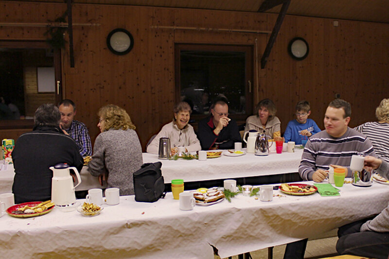Wenn die Kerzen heruntergebrannt waren, bewegte sich die versammelte Gemeinschaft erwartungsvoll in Richtung Wartburghütte. Betriebsame Helfer hatten dort die Tische festlich mit Tannengrün und Strohsternen geschmückt, Kerzen angezündet und den großen Holzofen im Tagesraum mächtig eingeheizt. Wegen des starken Andrangs musste man zusammenrücken, damit alle einen Platz fanden. Heißer Tee und/oder süßer Kakao wurden in bereitstehende Tassen gegossen und aus den mitgebrachten, buntgeschmückten Tüten wurden die ersten selbstgebackenen Weihnachtsplätzchen des Jahres auf die Teller gelegt. Während die eingefangene Kälte langsam aus den durchgefrorenen Gliedern zog, wurden die ersten freundlichen Worte mit dem Nebensitzer gewechselt. Neuigkeiten wurden ausgetauscht und Pläne verkündet. Der Geräuschpegel stieg und füllte den großen Raum. Enge und die wohlige Wärme vermittelten ein Gefühl von Gemütlichkeit. Irgendwann jedoch war das letzte Plätzchen gegessen und alle Vertraulichkeiten ausgetauscht, dann hieß es aufbrechen, zurück in das Alltagsleben. Nach soviel Wärme und Wohlgefühl gab es keinen Mantel, der dick genug gewesen wäre, das Frösteln auf dem dunklen Heimweg zu unterbinden. Ein letztes „Bis zum nächsten Jahr“ und dann gingen alle wieder auseinander. Viele nahmen das mit, was auch ich von der Waldweihnacht auf der Wartburghütte bis heute mitgenommen habe, die Erinnerung an ein Erlebnis in unberührter Natur zusammen mit gläubigen Menschen und verbunden mit der Hoffnung auf Frieden in unserer Welt.