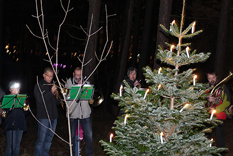 Endlich war es so weit, die Gruppe schien vollzählig, alle Vorbereitungen waren erfolgreich abgeschlossen und die Menschen setzen sich in Richtung Wald in Bewegung. Mitten im nahen Forst, oft auf einer kleinen Lichtung im Unterholz, hatten fleißige Hände eine Tanne geschmückt und Kerzen angezündet, auch mit der Hoffnung, dass der Wind sie nicht wieder auslöscht. Ganz in der Nähe standen die Mitglieder des Posaunenchores unter der Leitung von Arno Lanatowitz. Wenn der Kreis um die Tanne sich gefüllt hatte und alle zur Ruhe gekommen waren, spielte der Posaunenchor sein erstes weihnachtliches Lied. Wenn er aufgehört hatte, kehrte völlige Stille ein.