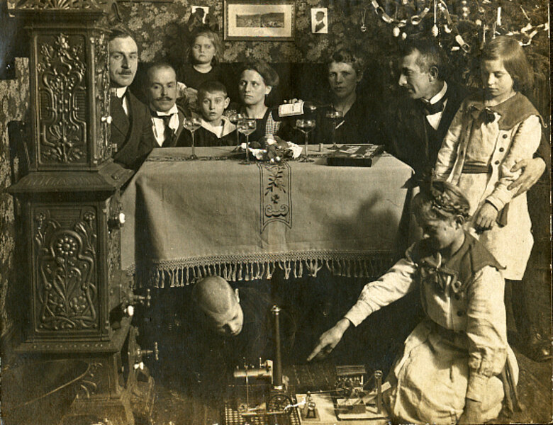 Eberhard Heinemann, 1924 geboren, wohnte mit seiner Familie in Salzmannshausen. Er erzählte von seiner frühsten Jugend in den zwanziger Jahren des letzten Jahrhunderts. „Bei mir zu Hause gab es eine solche wundervolle Dampfmaschine.“ Auf einem alten Foto sieht man wie die ganze Familie mit Begeisterung und Staunen dieses Spielzeug zu Weihnachten betrachtet.