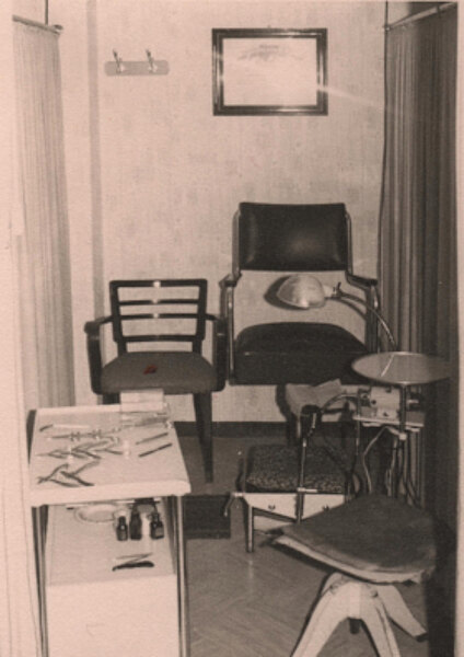 Aus finanziellen Gründen konnte er sich keine großen Praxisräume leisten, so begann er im damaligen Hochbunker (im heutigen Musikbunker) in einem Raum, in dem es keine Fenster gab, medizinische Fußpflege anzubieten. Dort hatte auch Zahnarzt Löwer seine Praxis und Papier-Groß das Büro und Lager. Mein Vater hatte außerdem noch die Aufgabe übernommen, den Bunker morgens aufzuschließen und abends wieder zu verschließen. Der monatliche Lohn betrug 12 DM.