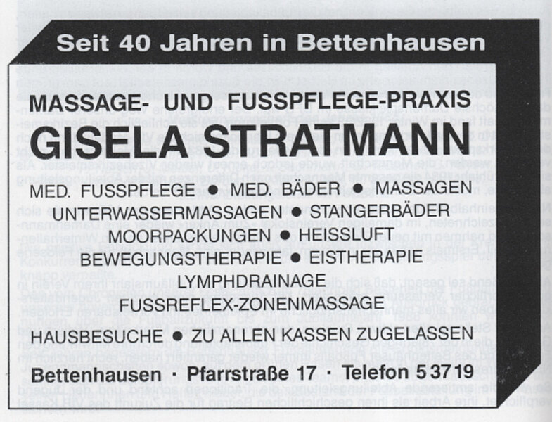 Die Praxis Stratmann hat in Bettenhausen eine lange Historie die bereits 1946 kurz nach dem Ende des Zweiten Weltkriegs unter schwierigen Bedingungen begann. Willi Stratmann, der Staatlich geprüfter Masseur, med. Bademeister und med. Fußpfleger war, machte in einem Bunker seine erste bescheidene Praxis auf. Über mehrere Umzüge und Erweiterungen der medizinischen Einrichtung fanden die Stratmanns ihren jetzigen Sitz in der Burgstraße 30 / Ecke Pfarrstraße. Dort betreibt die Physiotherapeutin Diana Carl-Menzel in dritter Generation die ortsbekannte Praxis für Physiotherapie. Ihre Mutter und Tochter des Gründers, Gisela Stratmann-Kaulitz, erzählt hier aus der Sicht der zweiten Generation beachtenswert offen wie alles begann.