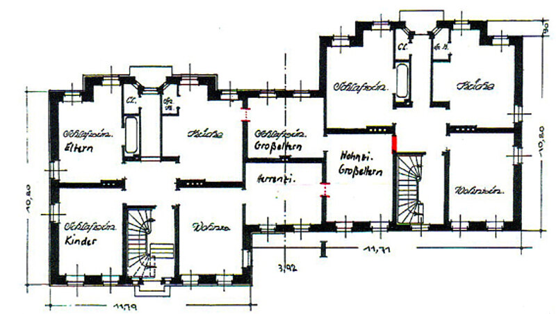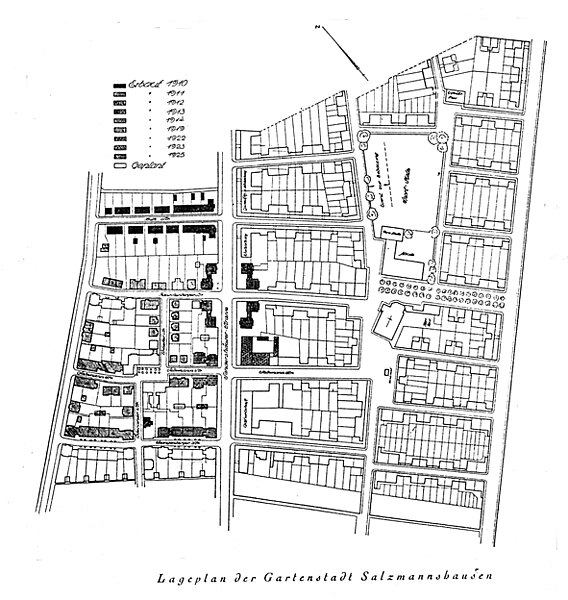 Wegen der Wohnungsnot nach dem Ersten Weltkrieg wurde das ursprünglich Konzept der Gartenstadt aufgegeben und Dreifamilienhäuser in Reihenhausbauweise sowie Versorgungsstätten des täglichen Bedarfs errichtet. Dazu gehörte das 1923 an der Ecke Sandershäuser Straße und Salzmannstraße errichtete dreigeschossige Bäckereigebäude. Die Pläne zur Erweiterung der Siedlung auf der rechten Seite der Sandershäuser Straße, dem Ostteil der Siedlung, nach einem preisgekrönten Entwurf von Professor Fischer aus München wurden 1935 durch den Bau des Autobahnzubringers (Dresdener Straße) verhindert. Der im Bild dargestellten Lageplan zeigt den Fischerschen Entwurf und zugleich die einzelnen Entwicklungsperioden der ganzen Anlage, die weiß dargestellten Gebäude blieben nur in der Planungsphase.