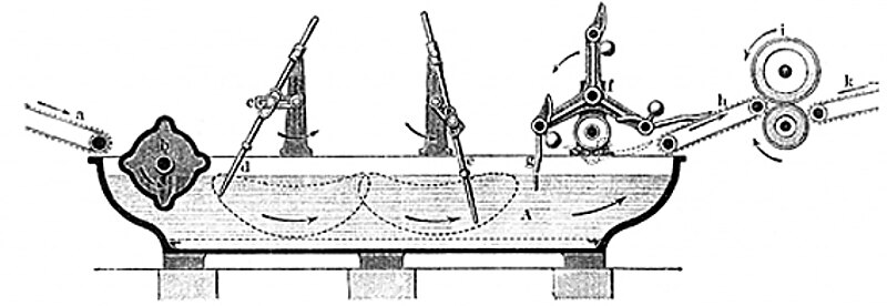 Professor Moritz Rühlmann berichtete in den Mitteilungen des hannoverschen Gewerbevereins im Jahre 1868 erstmals über die Anwendung einer Wollwaschmaschine, ausgestellt auf der Pariser Weltausstellung in 1867. Die erste Maschine dieser Art, die wegen ihrer Leistungsfähigkeit den Namen Leviathan erhielt, wurde 1863 von Melen in Verviers konstruiert und ist das Vorbild für alle späteren Waschmaschinen geblieben. Diese Maschine mit dem sonderbaren Namen Leviathan (Leviathan ist der Name eines Seeungeheuers der jüdisch-christlichen Mythologie) war offensichtlich in der Lage Wolle in größeren Mengen zufriedenstellend zu waschen. Zufriedenstellend hieß in diesem Zusammenhang, dass das Wollvlies von anhaftenden unerwünschten Bestandteile unter Belassung eines gewissen Wollfettanteils befreit wurde. Während das ausgewaschene Wollfett zu großen Teilen aufgefangen wurde und als Lanolin bei der Salbenherstellung Verwendung fand, wurden die eingesetzten Reinigungsmittel und das Schmutzwasser unbehandelt in möglichst naheliegende Gewässer geleitet. Die negativen Folgen für Umwelt und Natur blieben bis zur Jahrtausendwende ohne Beachtung.