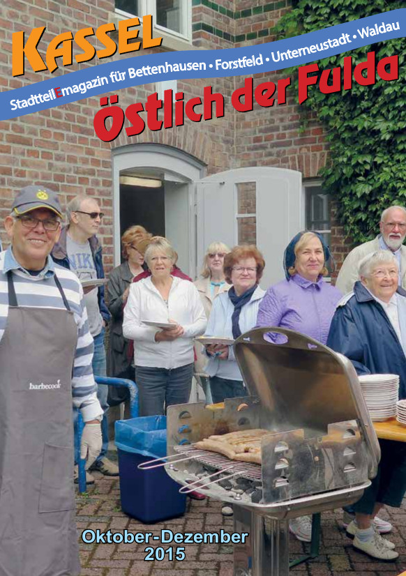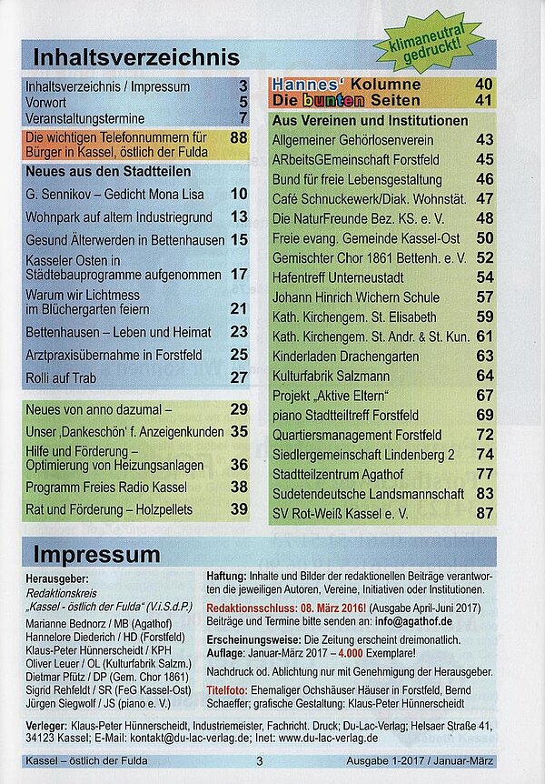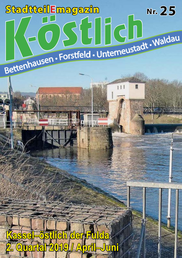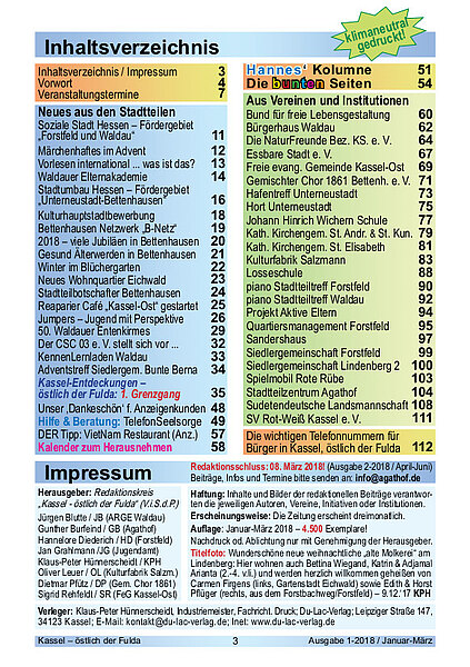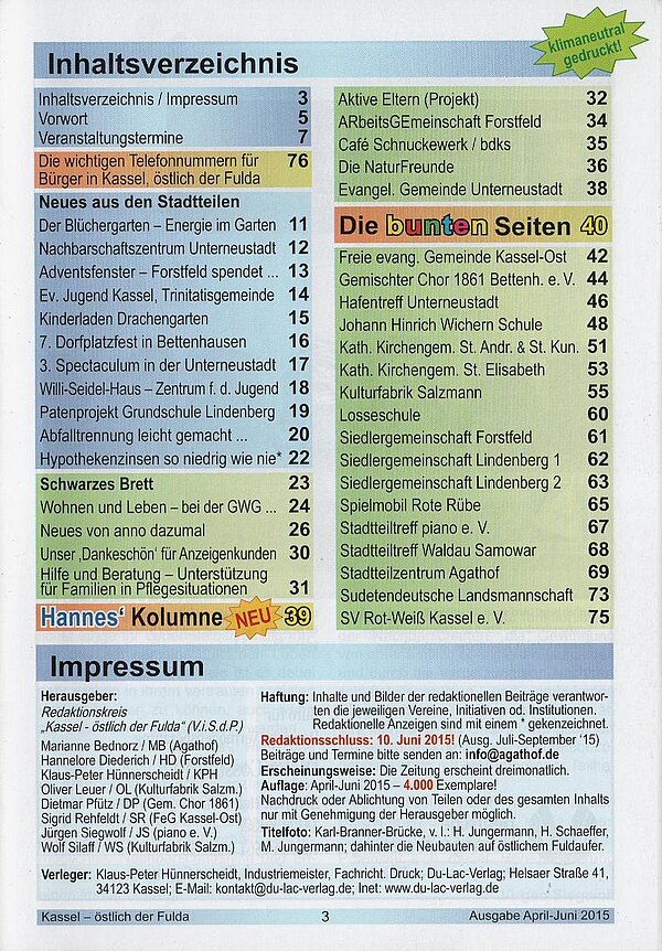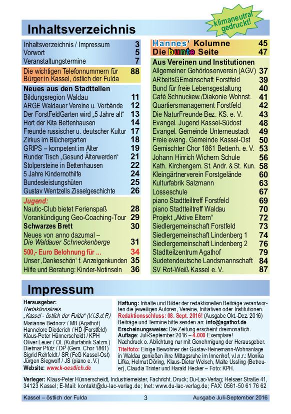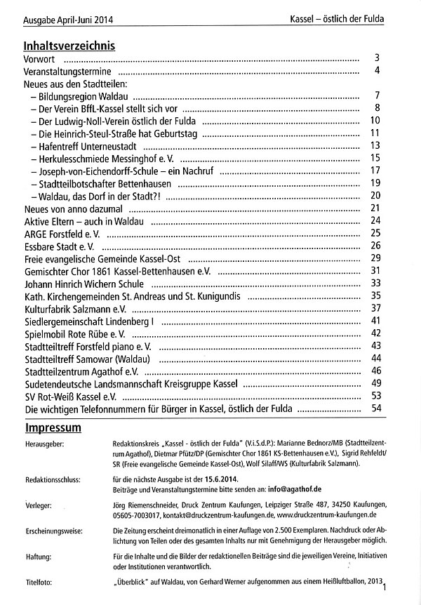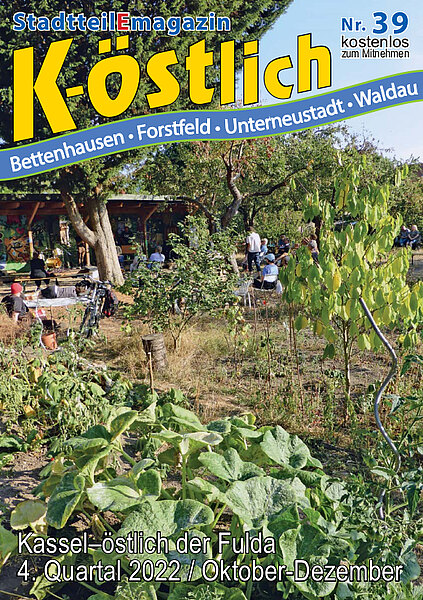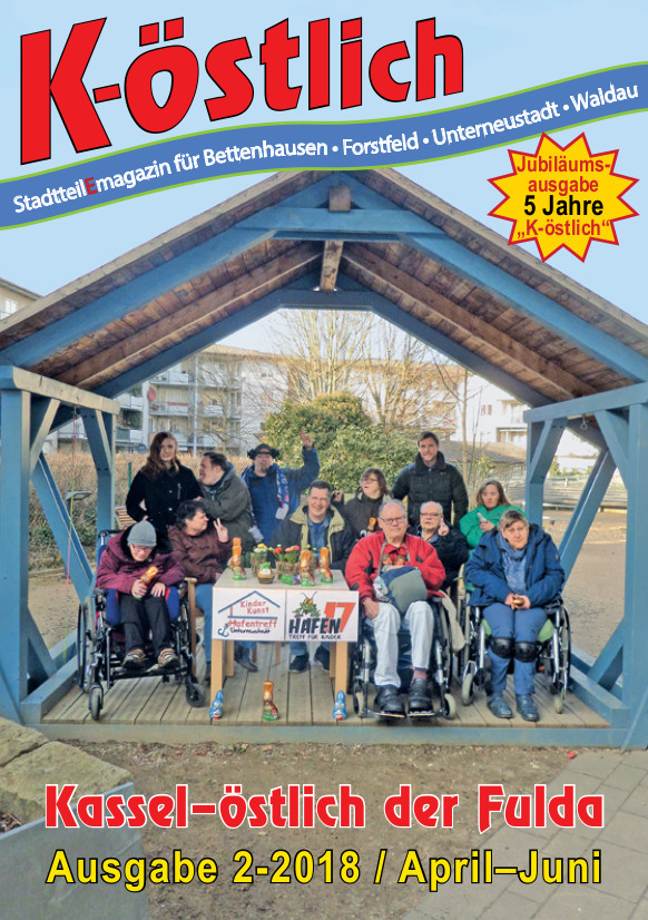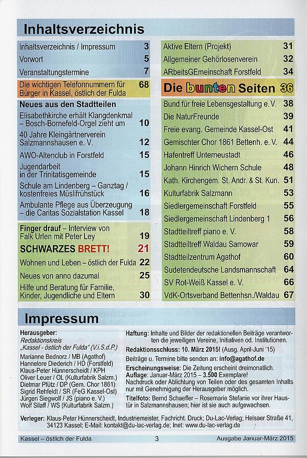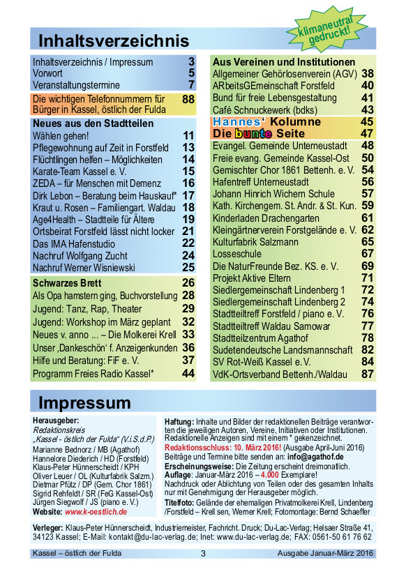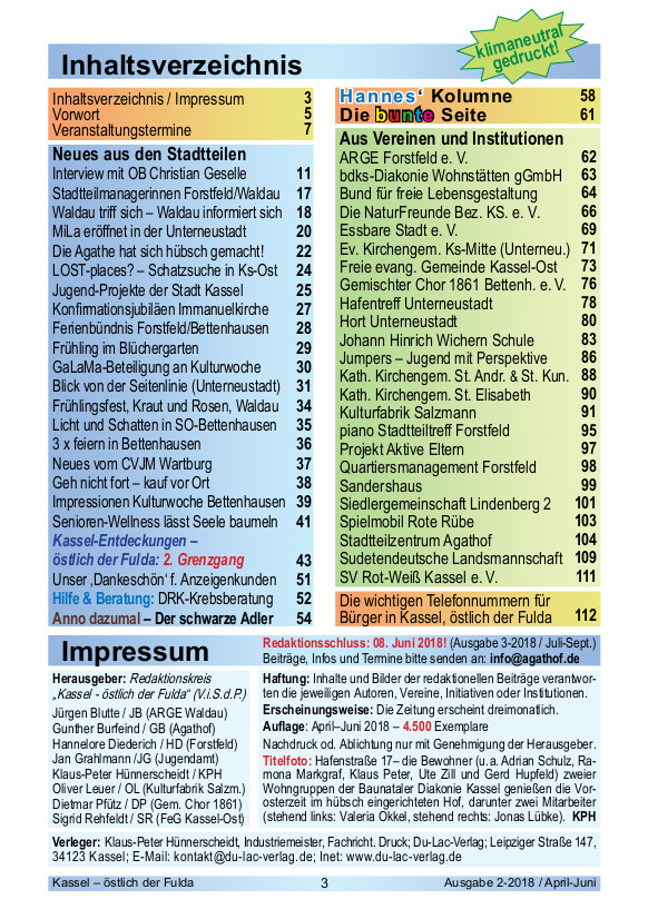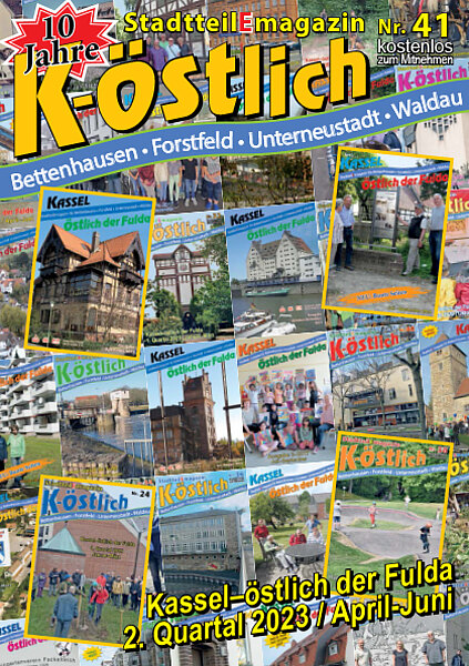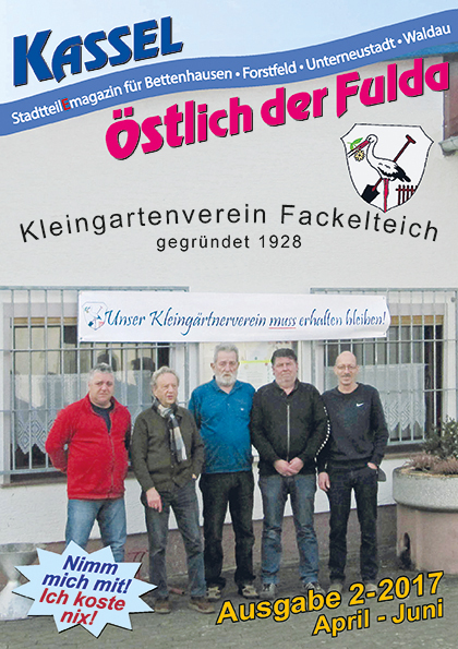 Jubiliäumsausgabe! Das kostenlose Stadtteilemagazin „Kassel östlich der Fulda“ wird in allen 4 Stadtteilen des Kasseler Ostens ausgelegt. Die Zeitung erscheint quartalsweise in einer Auflage von ca. 4500 Exemplaren. Verleger ist Kaus-Peter Hünnerscheidt Du-Lac-Verlag, Helsaer Str. 41, 34123 Kassel. Infos und Termine bitte an info(at)agathof.de senden.