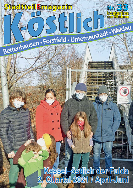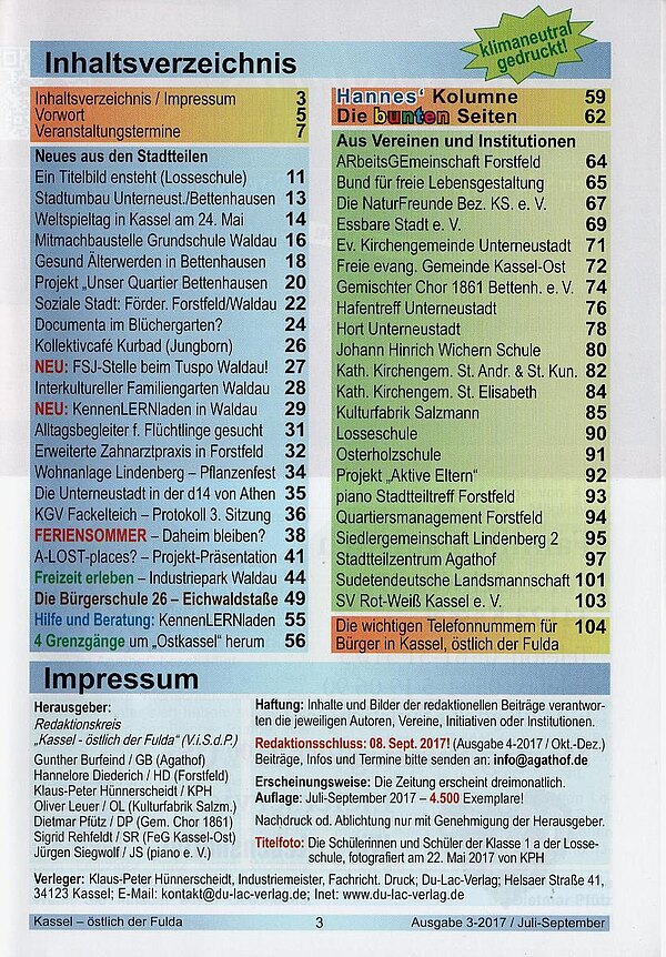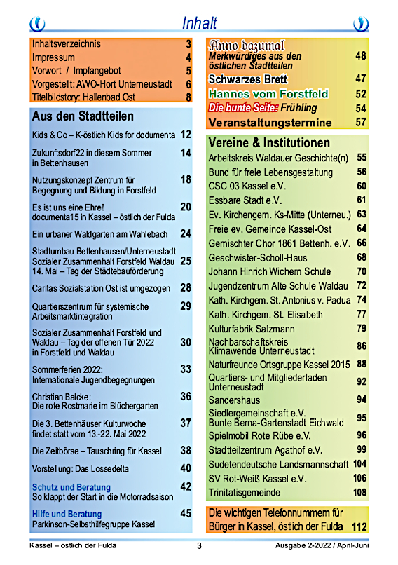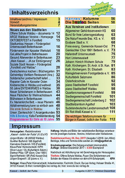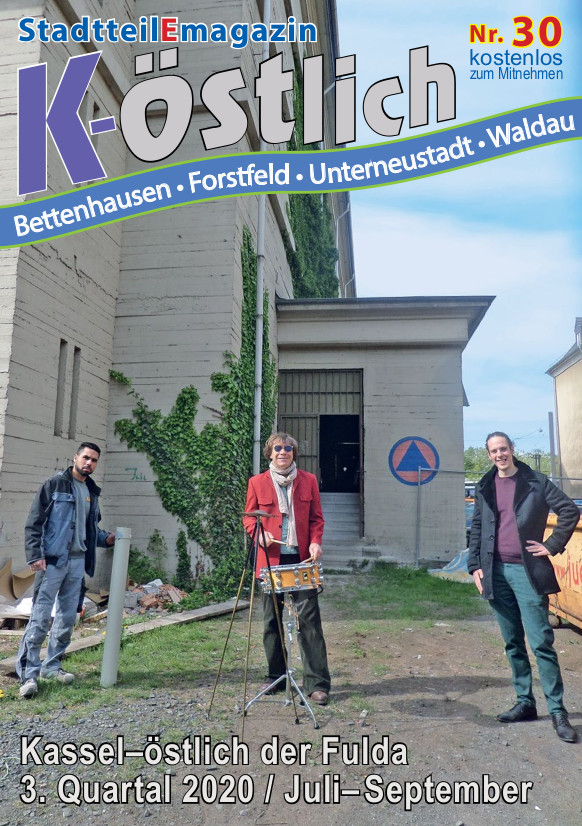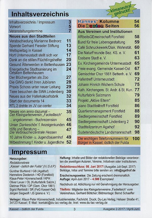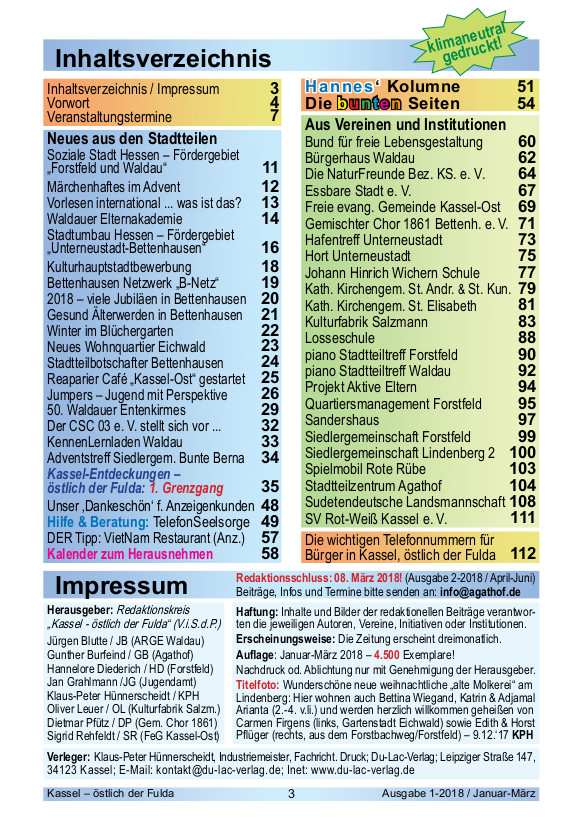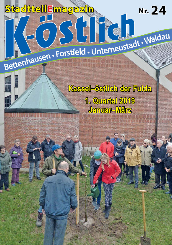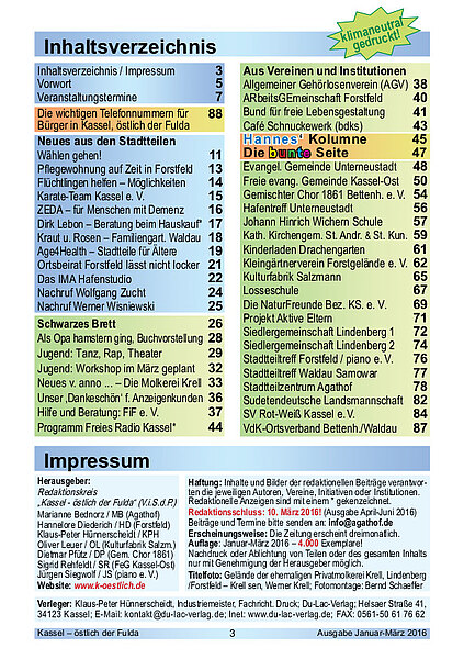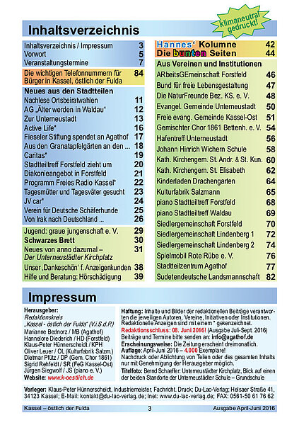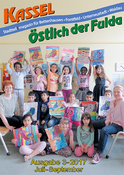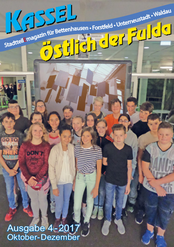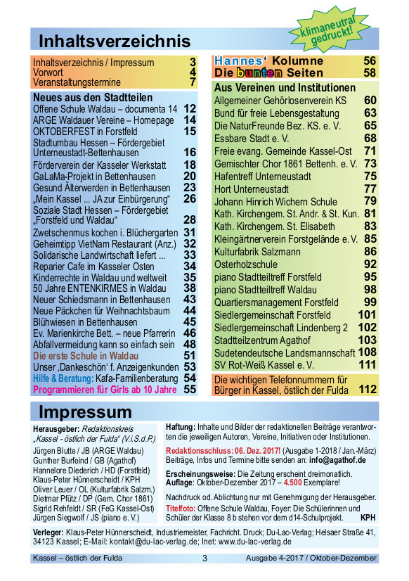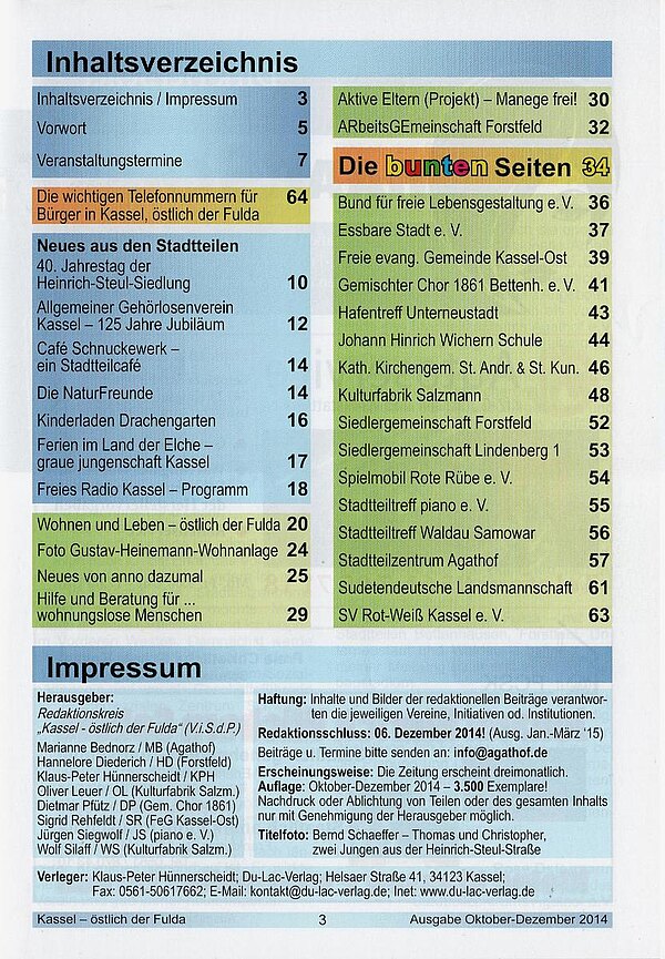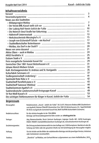 Jubiliäumsausgabe! Das kostenlose Stadtteilemagazin „Kassel östlich der Fulda“ wird in allen 4 Stadtteilen des Kasseler Ostens ausgelegt. Die Zeitung erscheint quartalsweise in einer Auflage von ca. 4500 Exemplaren. Verleger ist Kaus-Peter Hünnerscheidt Du-Lac-Verlag, Helsaer Str. 41, 34123 Kassel. Infos und Termine bitte an info(at)agathof.de senden.