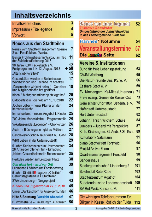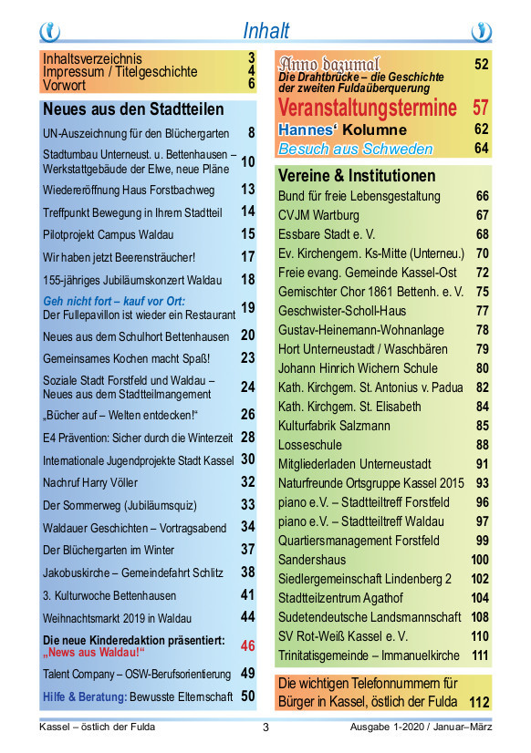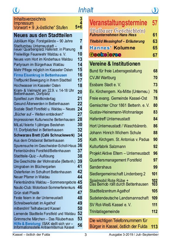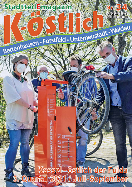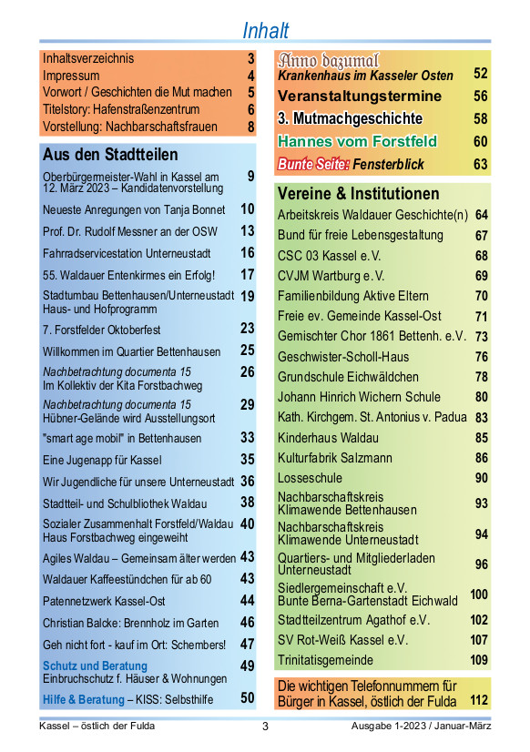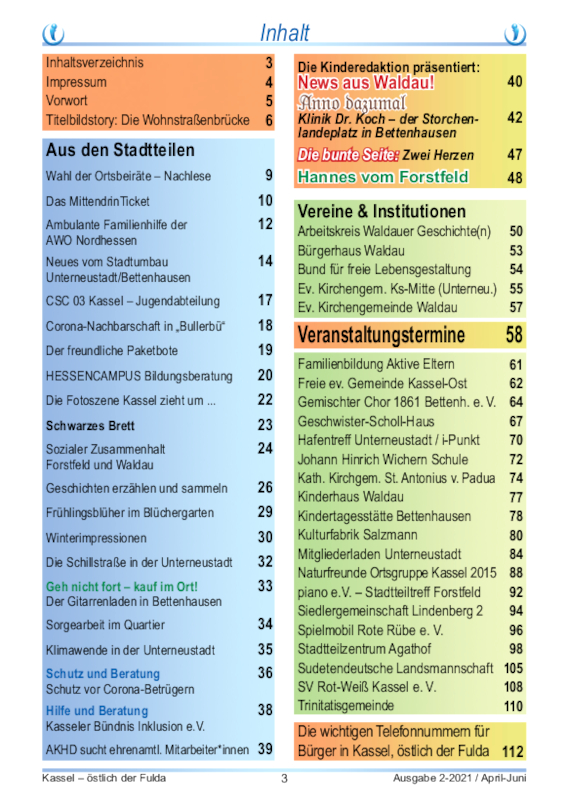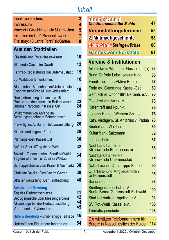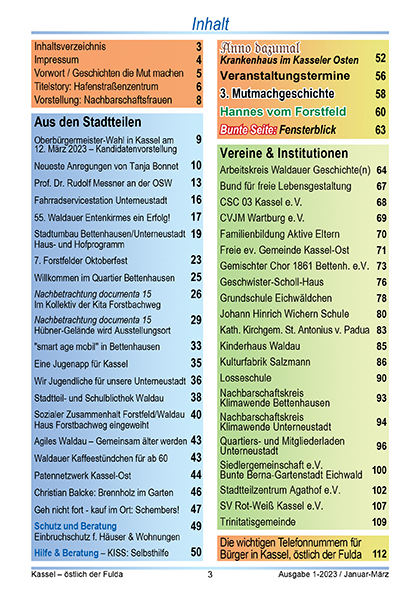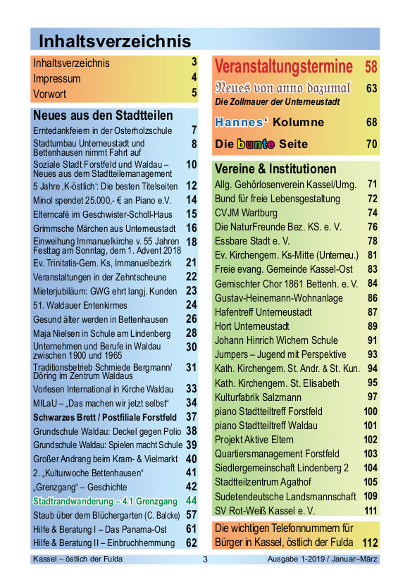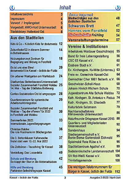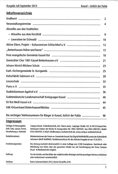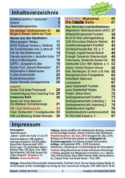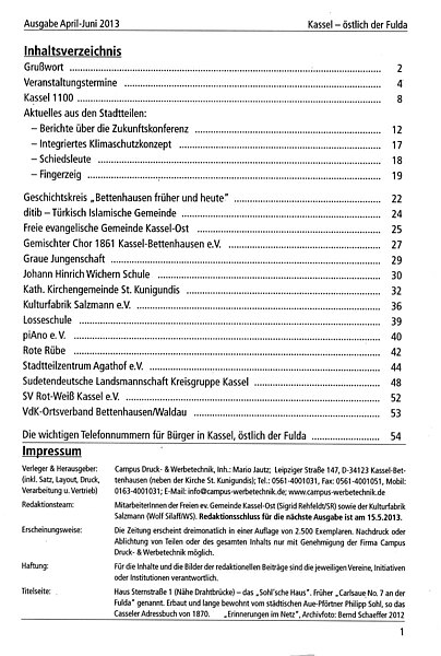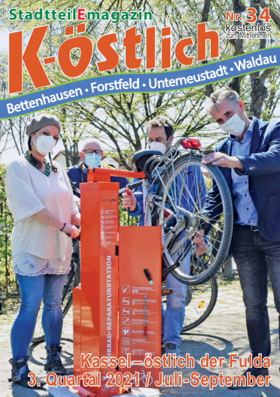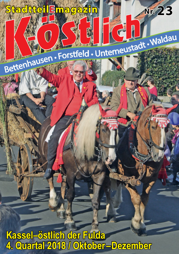 Jubiliäumsausgabe! Das kostenlose Stadtteilemagazin „Kassel östlich der Fulda“ wird in allen 4 Stadtteilen des Kasseler Ostens ausgelegt. Die Zeitung erscheint quartalsweise in einer Auflage von ca. 4500 Exemplaren. Verleger ist Kaus-Peter Hünnerscheidt Du-Lac-Verlag, Helsaer Str. 41, 34123 Kassel. Infos und Termine bitte an info(at)agathof.de senden.