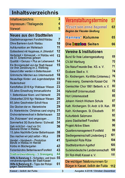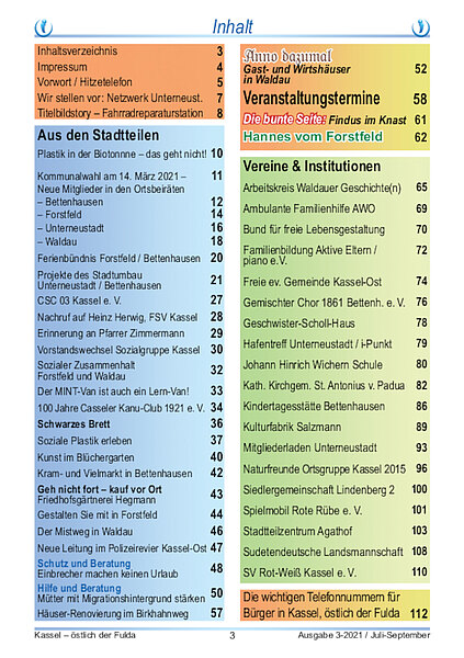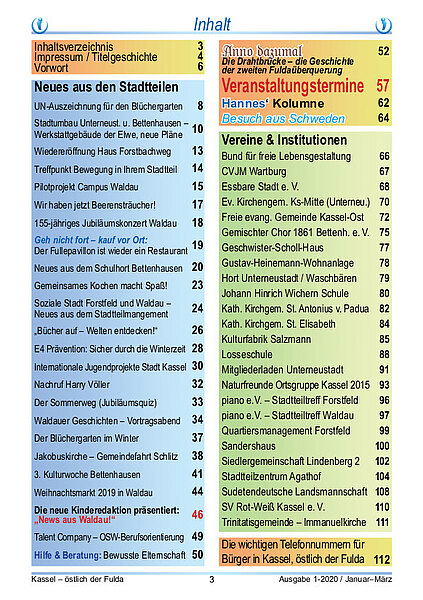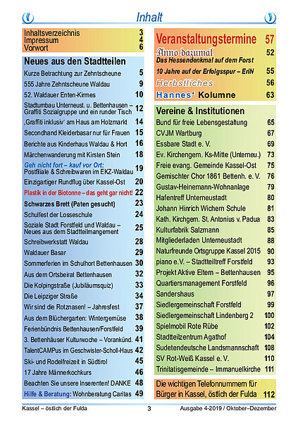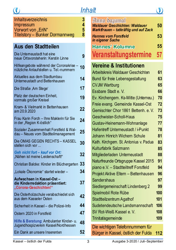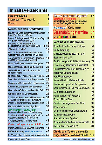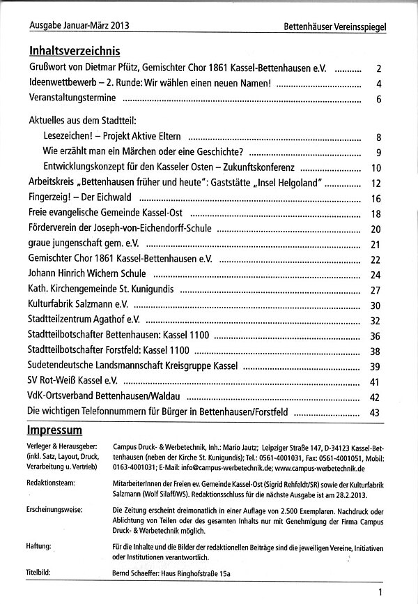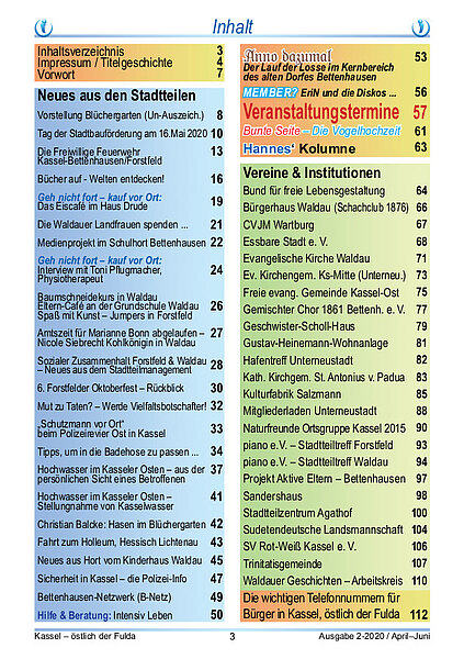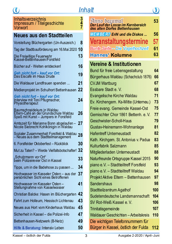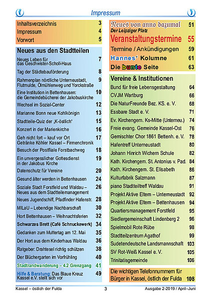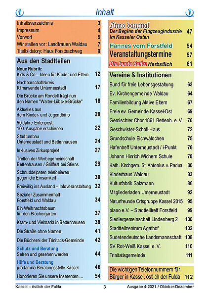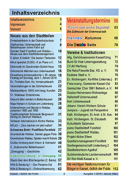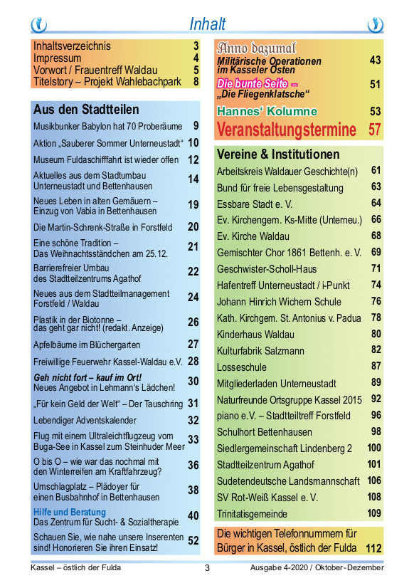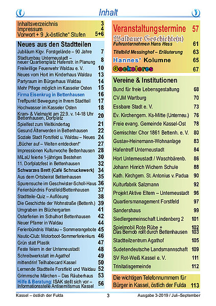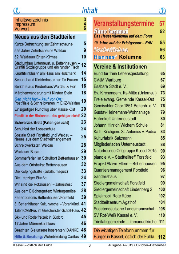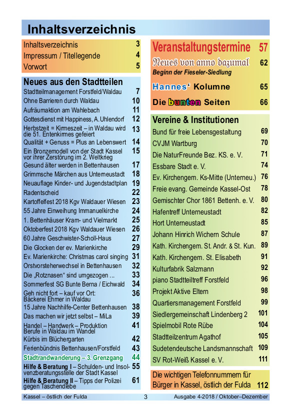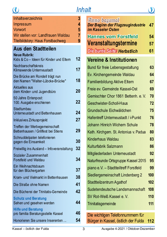 Jubiliäumsausgabe! Das kostenlose Stadtteilemagazin „Kassel östlich der Fulda“ wird in allen 4 Stadtteilen des Kasseler Ostens ausgelegt. Die Zeitung erscheint quartalsweise in einer Auflage von ca. 4500 Exemplaren. Verleger ist Kaus-Peter Hünnerscheidt Du-Lac-Verlag, Helsaer Str. 41, 34123 Kassel. Infos und Termine bitte an info(at)agathof.de senden.