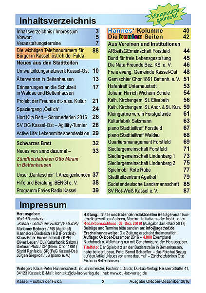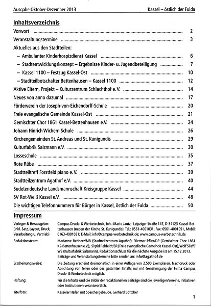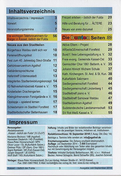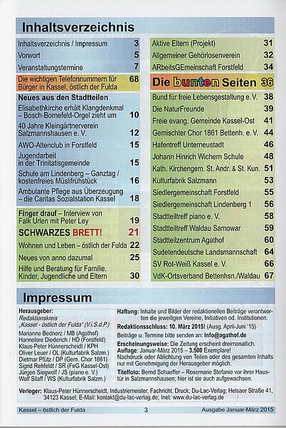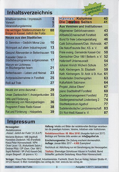 Das kostenlose Stadtteilemagazin „Kassel östlich der Fulda“ wird in allen 4 Stadtteilen des Kasseler Ostens ausgelegt. Die Zeitung erscheint quartalsweise in einer Auflage von ca. 4500 Exemplaren. Verleger ist Kaus-Peter Hünnerscheidt Du-Lac-Verlag, Leipziger Str. 147, 34123 Kassel. Infos und Termine bitte an info(at)agathof.de senden.
