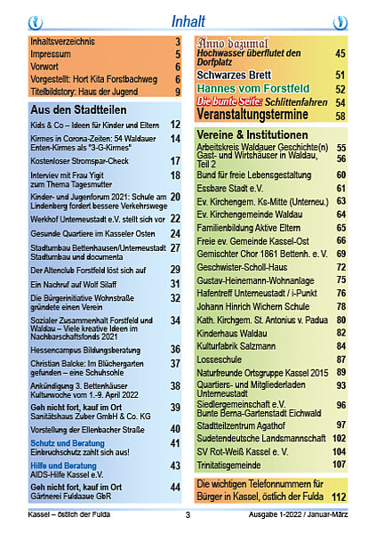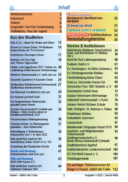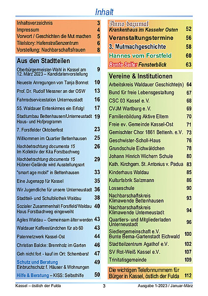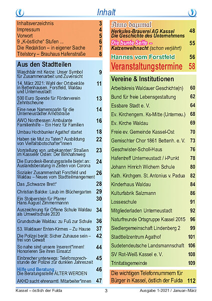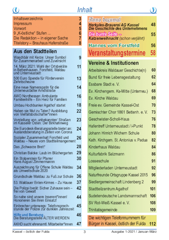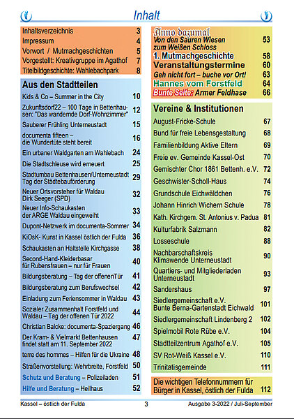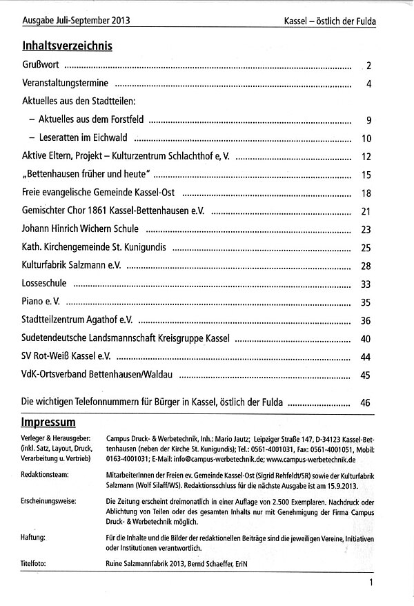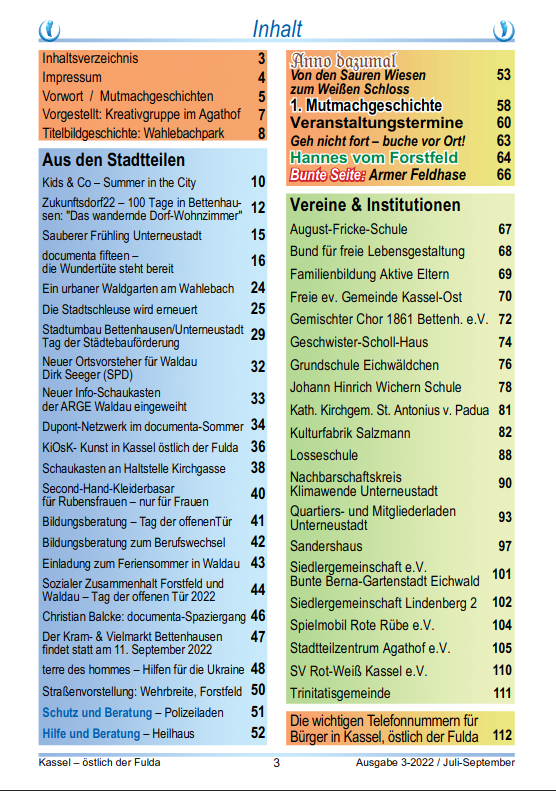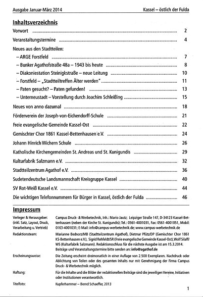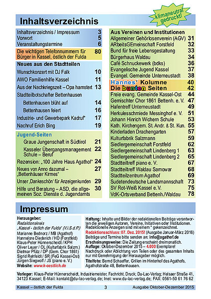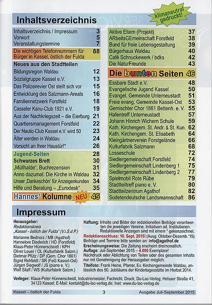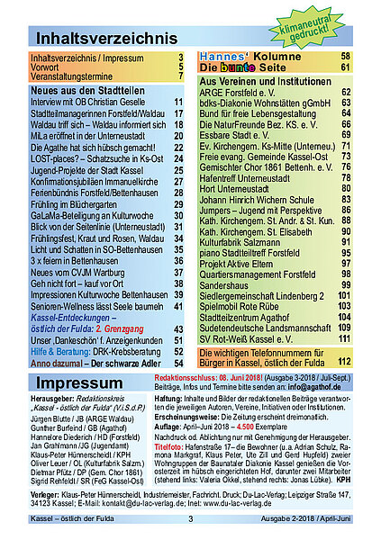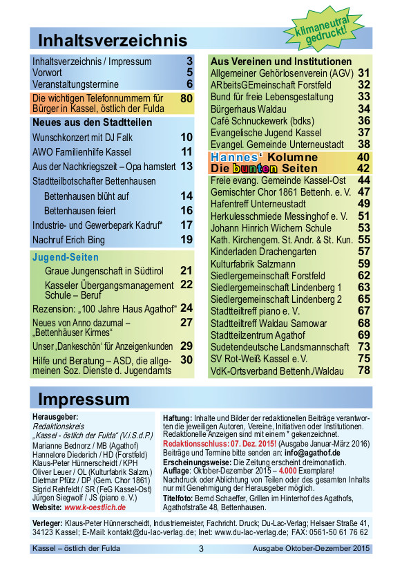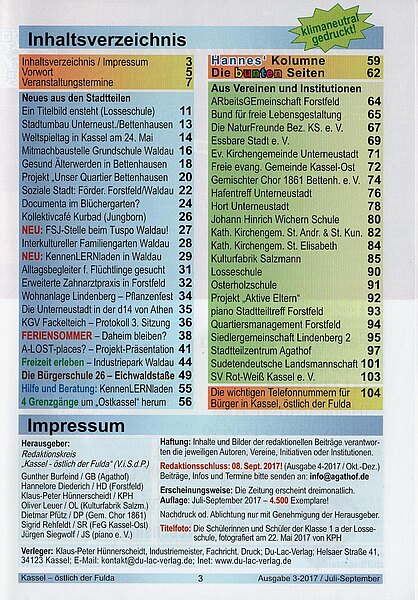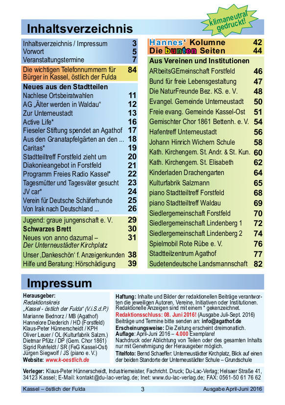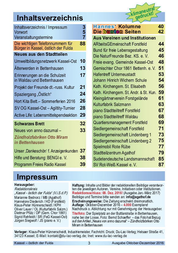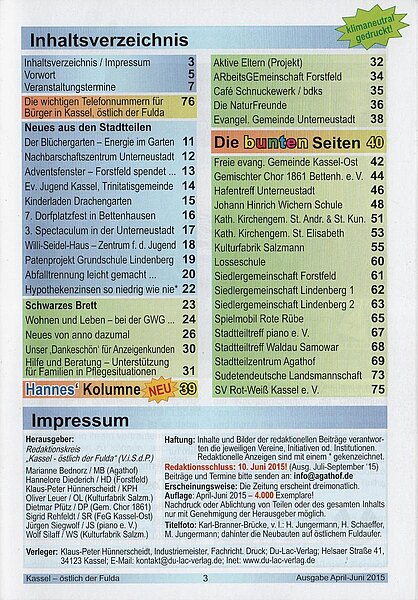 Das kostenlose Stadtteilemagazins „Kassel östlich der Fulda“ wird in allen 4 Stadtteilen des Kasseler Ostens ausgelegt. Die Zeitung erscheint quartalsweise in einer Auflage von ca. 4500 Exemplaren. Verleger ist Kaus-Peter Hünnerscheidt Du-Lac-Verlag, Helsaer Str. 41, 34123 Kassel. Infos und Termine bitte an info(at)agathof.de senden.